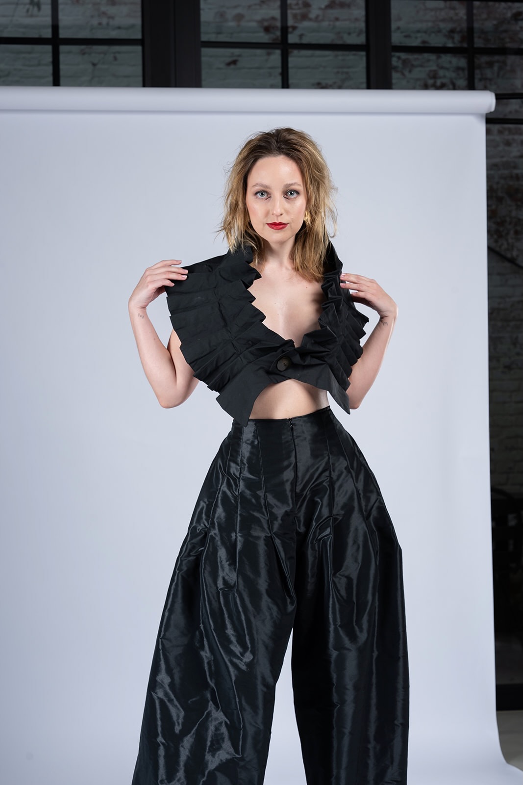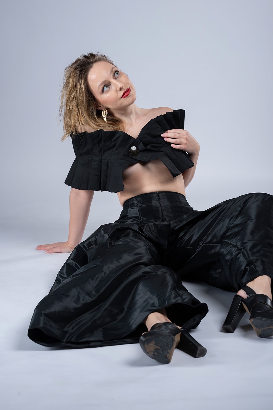 The Rembrandt is a versatile statement piece that can be worn as a structured top or styled as a "kraag" (collar) over other garments. Featuring sculpted pleats and an off-the-shoulder design, it brings a refined yet bold touch to any outfit. An oversized button detail adds a distinctive accent, enhancing its architectural silhouette.